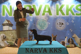 Aamulla päästyämme ulos laivasta ulkoilu teki hyvää. Take away -kahvien kera lähdimme suuntaamaan kohti Narvaa. Noin parin tunnin ajamisen jälkeen olimme perillä näyttelypaikalla ja suuntasimme pikaisesti kohti mäyriskehää. Hilma olisi vuorossa aamulla ensimmäisten joukossa ja ei siinä paljoa luppoaikaa jäänyt ennen kehän alkua. Vähän siinä yritin ottaa koiran kanssa tuntumaa hälinään ja ahtauteen ja Hilmakin oli sinänsä ihan ok, ottaen em. huomioon. Käpsyjä oli vain neljä ja kaksi narttua, joista toinen oli jo Vironkin valio. Paperilla näytti siis ihan hyvältä. Mutta sitten, mitä tekeekään minun showkoira? Se josta aina sanon, että kulkee kuin juna. No, se sanoo kehään mennessä työsopimuksen totaalisesti irti. Ei vaan pysty liikkumaan kunnolla. Suuri ihmisjoukko kehän ympärillä oli pitkästä aikaa liikaa. Omaa vuoroa odotellessa yritin hieman leikittää koiraa ja saada sitä vähän rentoutumaan, mutta ei kovin kehuttavin tuloksin. Hilma sai kuitenkin ihan ok arvostelun Harry Tastilta, joka oli tuomaroimassa. Todella mukavakäytöksinen herra, by the way. Saimme jonkinlaiset liikkeet esiteltyä, mutta liikkumisen nihkeys toi arvosanan Erittäin Hyvä. Voi luoja, että olin vihainen itselleni! Miksi minä en käynyt vaikka Jyväskylässä huvikseen ottamassa tuntumaa??? Tai jossain muussa sisänäyttelyssä. Tai vaikka mätsärissä. Minä vain niin luotin tuohon "junaani", että kyllähän se kulkee. Tyhmyydestä sakotetaan ja tyhmästä päästä kärsii etenkin lompakko. Koira sai kuitenkin kunnon rapsutukset, eihän se sen vika ole, että se on raahattu vaikka millä kulkupelillä ihan ihme kieltä puhuvien outojen ihmisten sumppuun. Ja niin Hilma poistui kehästä häntä heiluen. Niin kyllä se siinä vaiheessa sitten heilui.